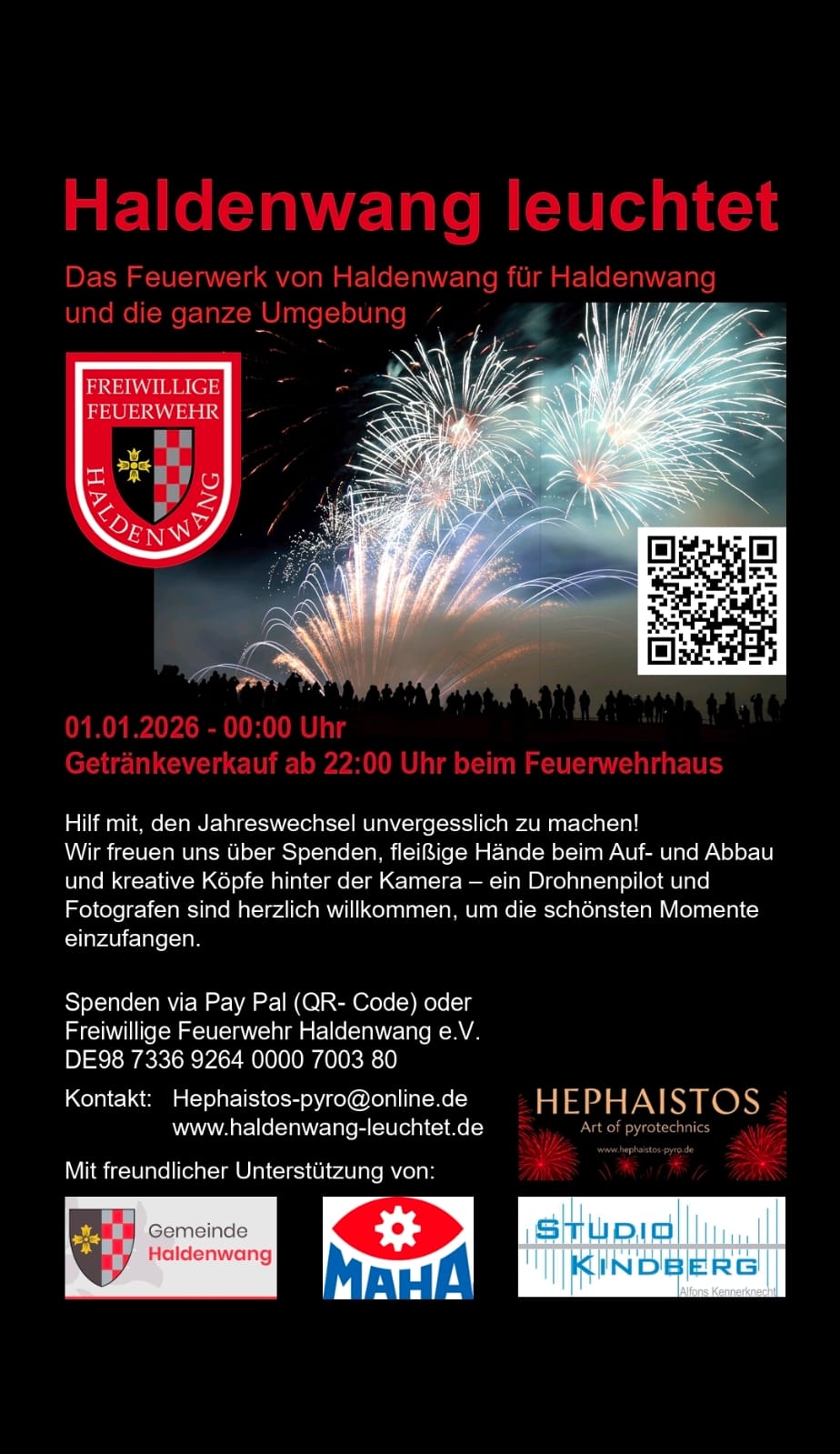 Liebe Gemeindebürgerinnen und -bürger, vielen herzlichen Dank für ihre Spendenbereitschaft, damit wir das große Feuerwerk zum Jahreswechsel am Feuerwehrhaus veranstalten konnten. Nur durch ihre Hilfe war es uns möglich dieses eindrucksvolle und schöne Erlebnis zum neuen Jahr stattfinden zu lassen. Unser Dank gilt auch der Gemeinde Haldenwang, mit Herrn Bürgermeister Wölfle und dem gesamten Gemeinderat für ihre Unterstützung. Ein besonderer Dank gilt Christian Owsinski und seinem Team der Allgäuer Pyrotechnik mit Klaus Müller, die das Feuerwerk geplant und durchgeführt haben und dem Studio Kindberg mit Alfons Kennerknecht. Die vielen positiven Rückmeldungen und Resonanzen werden wir in unsere weitere Planungen für eine mögliche Wiederholung zum nächsten Jahreswechsel 2023/2024 einfließen lassen. Wir wünschen ihnen allen einen erfolgreichen Start ins neue Jahr 2023, viel Glück, Gesundheit und den Schutz des heiligen Florians.